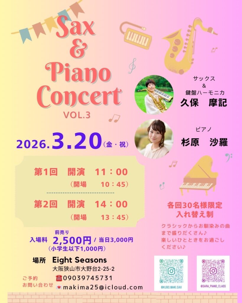 SAX&PIANO CONCERT vol.3 投稿者: Eight Seasons2026年1月28日2026年1月28日お知らせ 民公館で大人気のサックス&ピアノコンサートがまた3月20日に開催されます。ご予約はお早めに!