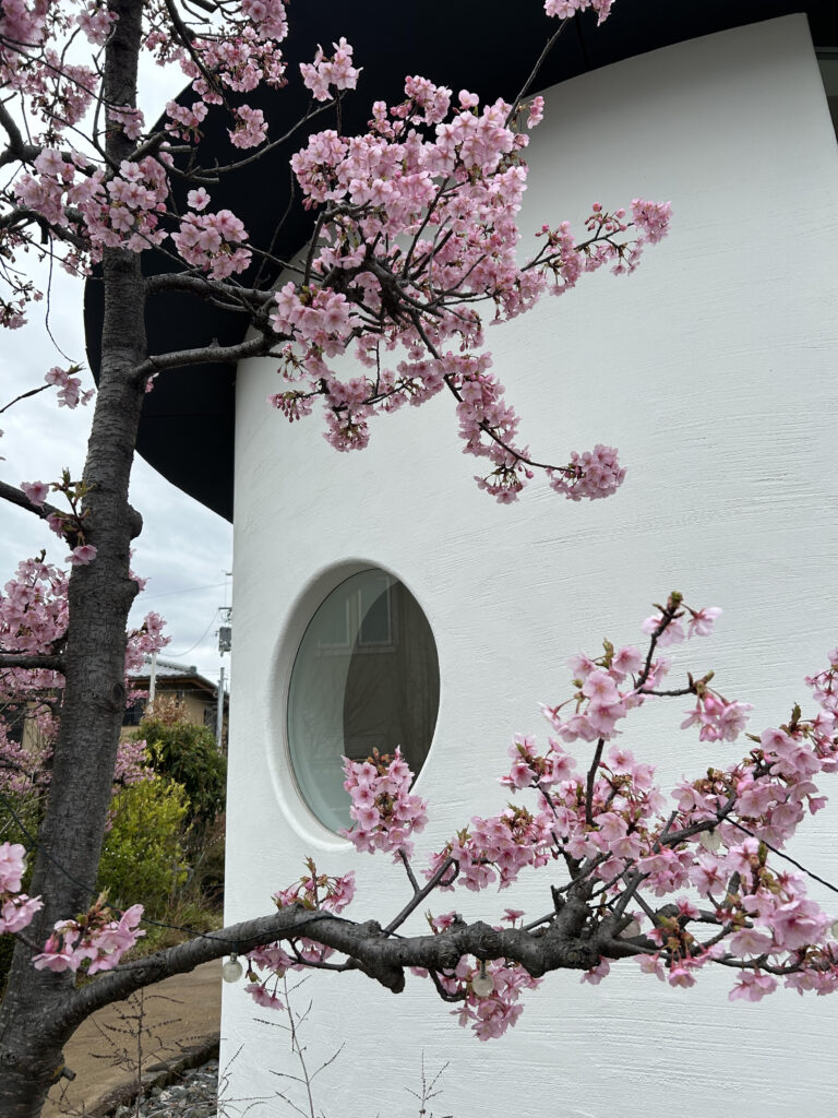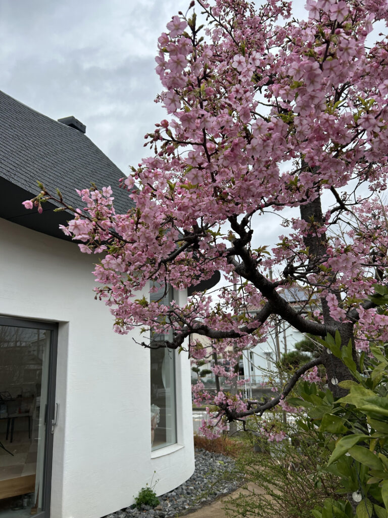 玄関前や丸窓前の河津桜がほぼ満開になりました。