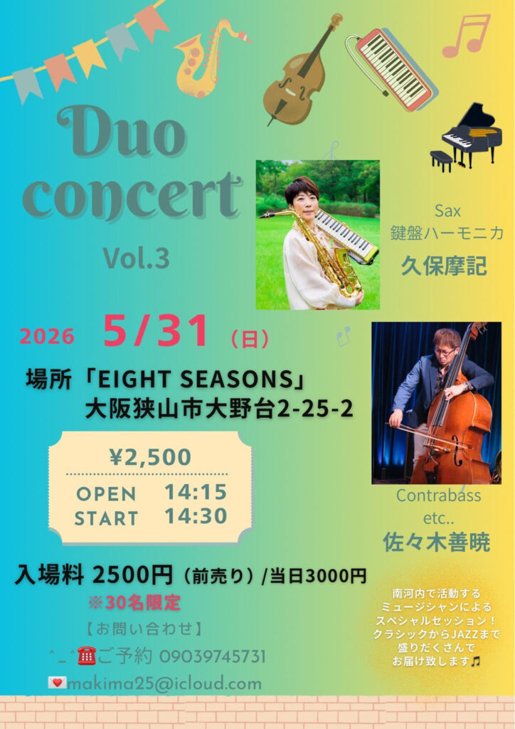 Duo concert vol.3 投稿者: Eight Seasons2026年3月26日2026年3月26日お知らせ 前回も大好評だった、「サックス&コントラバス‐Duo concert‐vol.3」が5月31日(日)に開催されます。お早めにご予約を!